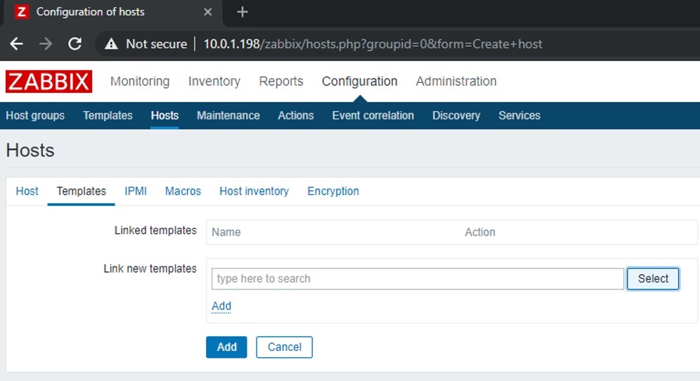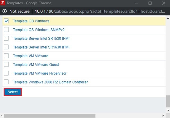Tại tab Templates, ta sẽ chọn template dịch vụ sẽ được monitor phù hợp với host mà ta add, nhấn Select