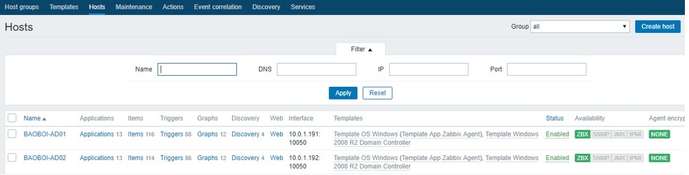 Theo mô hình, ta có hai host windows là BAOBOI-AD01 và BAOBOI-AD02. Ta sẽ cấu hình để Zabbixitforvn giám sát hai host windows trên. Hai host windows này phải chung lớp mạng vơi Zabbixitforvnvà phải ping thông nhau. Nếu bạn nào chưa biết mô hình thì có thể xem lại link ở bài trước tại đây.