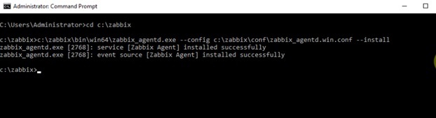 Bật cửa sổ Command Prompt chạy với quyền Administrator, ta nhập câu lệnh để install dịch vụ Zabbix Agent: C:\zabbix\bin\win64\zabbix_agents.exe –config c:\zabbix\conf\zabbix_agents.win.conf –install Sau khi cài đặt, thông báo cài đặt thành công sẽ xuất hiện