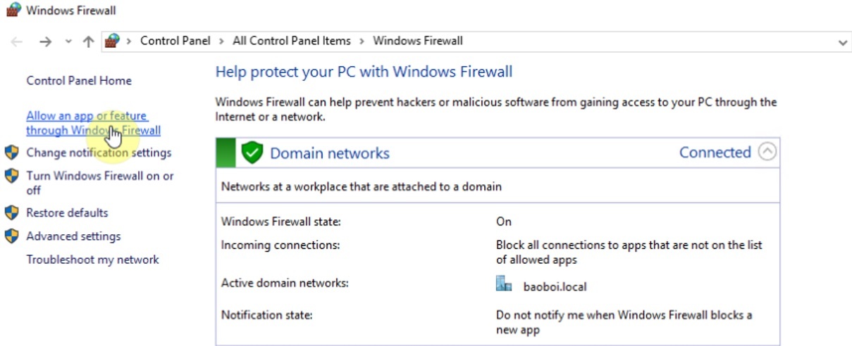 Mở giao diện Windows Firewall và chọn All an app or feature through Window Firewall