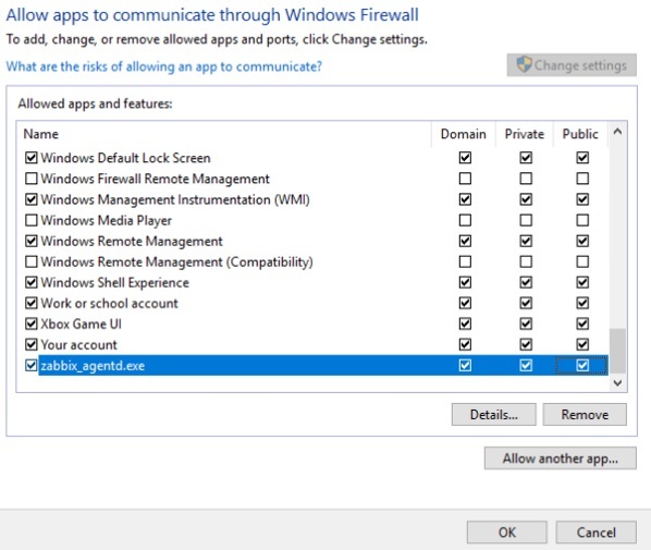 Tại giao diện Allow apps to communicate through Windows Firewalll, ta chọn Zabbix_agentd.exe và check vào mục domain, private, public. Sau đó, nhấn OK