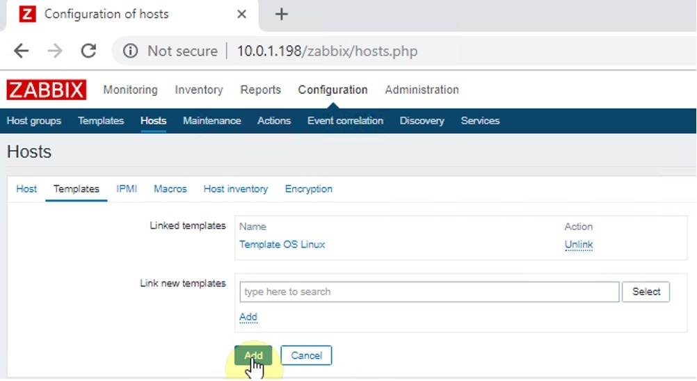 Sang tab Templates, chọn add Template OS Linux và nhấn Add.