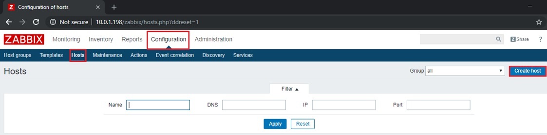 Vào mục Configuration, chọn Host, nhấn Create Host