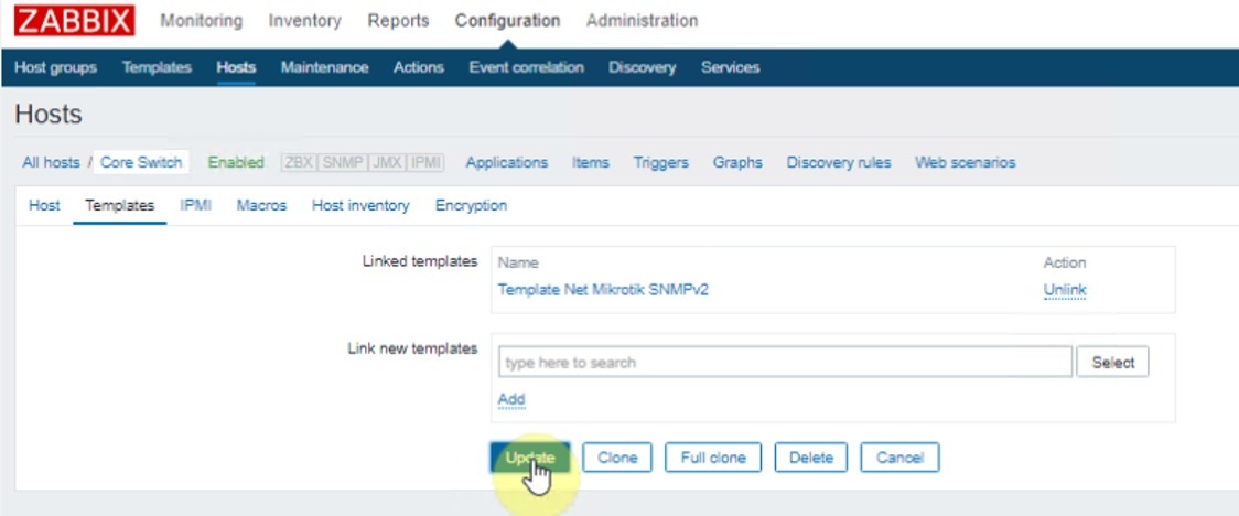 Sang tab Templates, tùy theo loại thiết bị mà ta sẽ add vào cho phù hợp. Ở trường hợp này, Core Switch thuộc này là Mikrotik nên ta sẽ add Template Net Mikrotik SNMPv2.